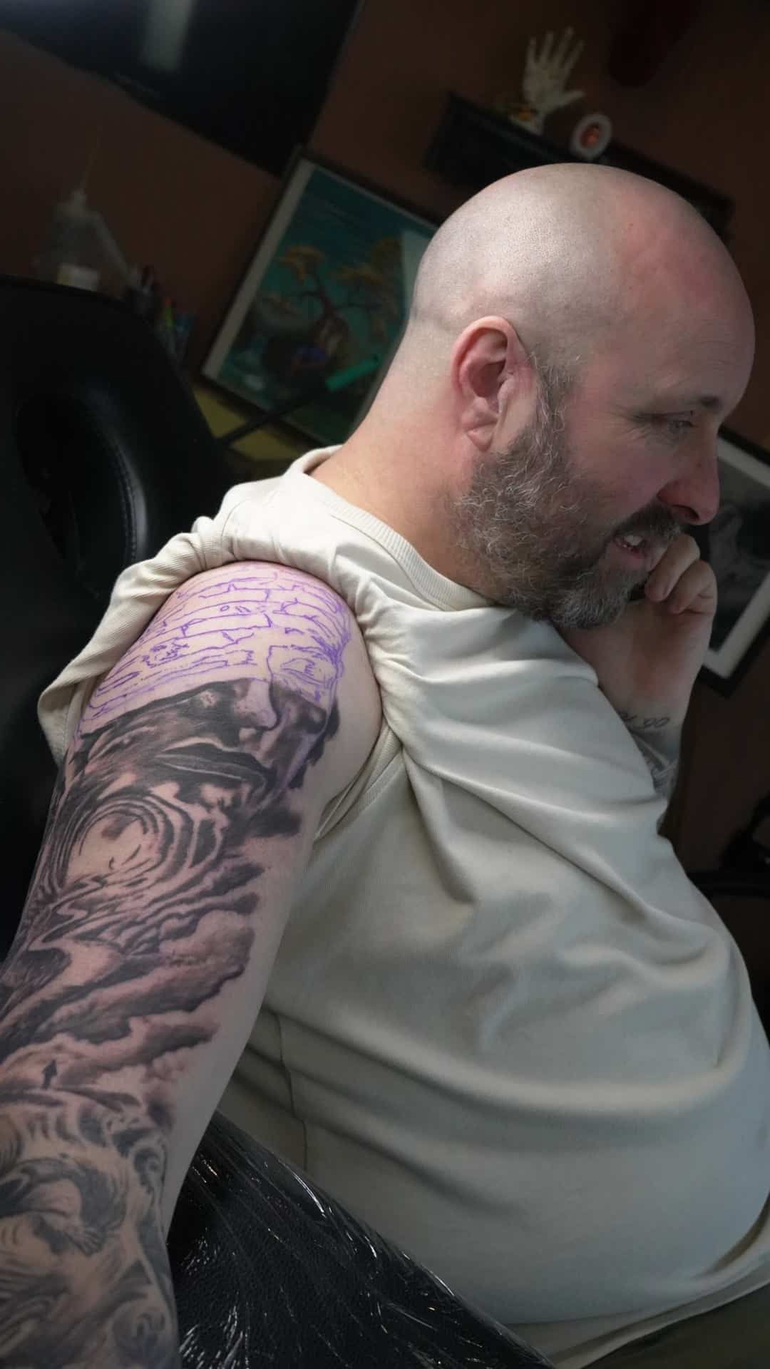 • A man has a tattoo of a woman 's face on his arm.